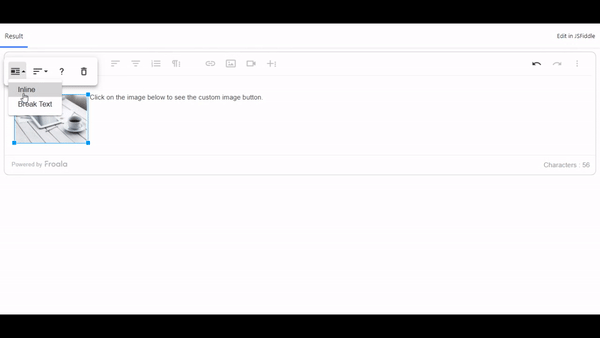 With Froala, users can develop custom buttons on an image to provide functionality such as Display (Inline or Break text), Align (left, center, right, justify), Info (image info) and Remove (delete image). All you need to do is define these buttons in โimageEditButtonsโ in JS.