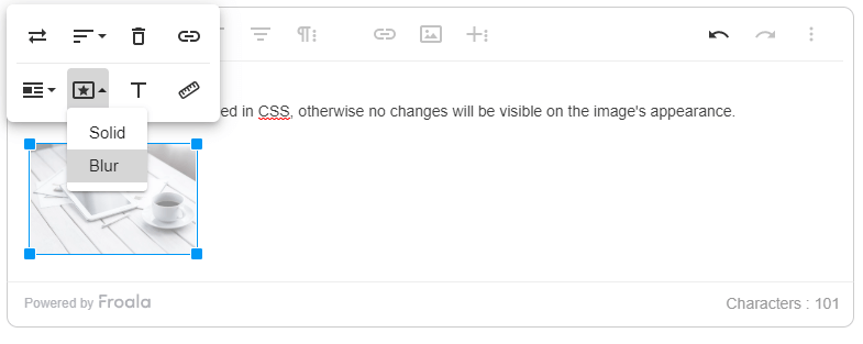 Users can define their own image styles using โimageStylesโ options. For example, when you click the image, custom styling options are presented. Here we are using โSolidโ and โBlurโ effects for the selected image.ย ย