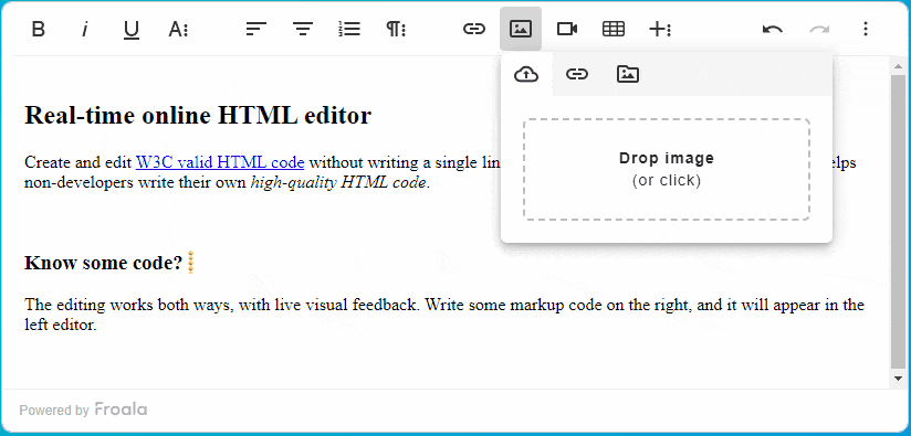 - Drag-and-drop: One of the functionalities that make Froala an easy editor is its drag-and-drop functionality. This allows users to easily add elements by literally just dragging and dropping them on the canvas.