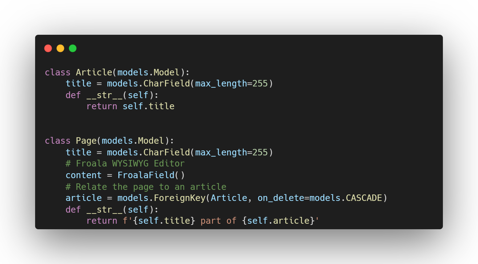 The knowledge base will be separated usingย Articlesย that have their ownย Pages. Anย Articleย can have manyย Pages,ย butย Pagesย can only be associated with oneย Article. This is to keep the complexity low while also being a functional knowledge base application. You can customize the logic if you want, but thatโ€™s not within reach of this tutorial. This tutorial will focus on Froalaโ€™s integration with Django; this means you can further customize the models to your liking, but we will just be covering the above use case for the sake of simplicity.