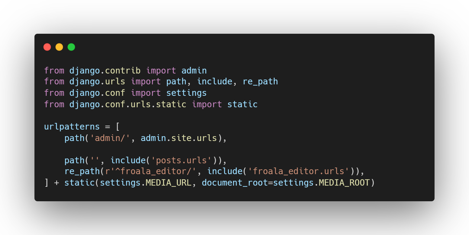 According to the docs, you need to add url(rโ€™^froala_editor/โ€™, include(โ€˜froala_editor.urlsโ€™)), the project urls, but url is not used anymore and is replaced with re_path so we will be using re_path instead of url.