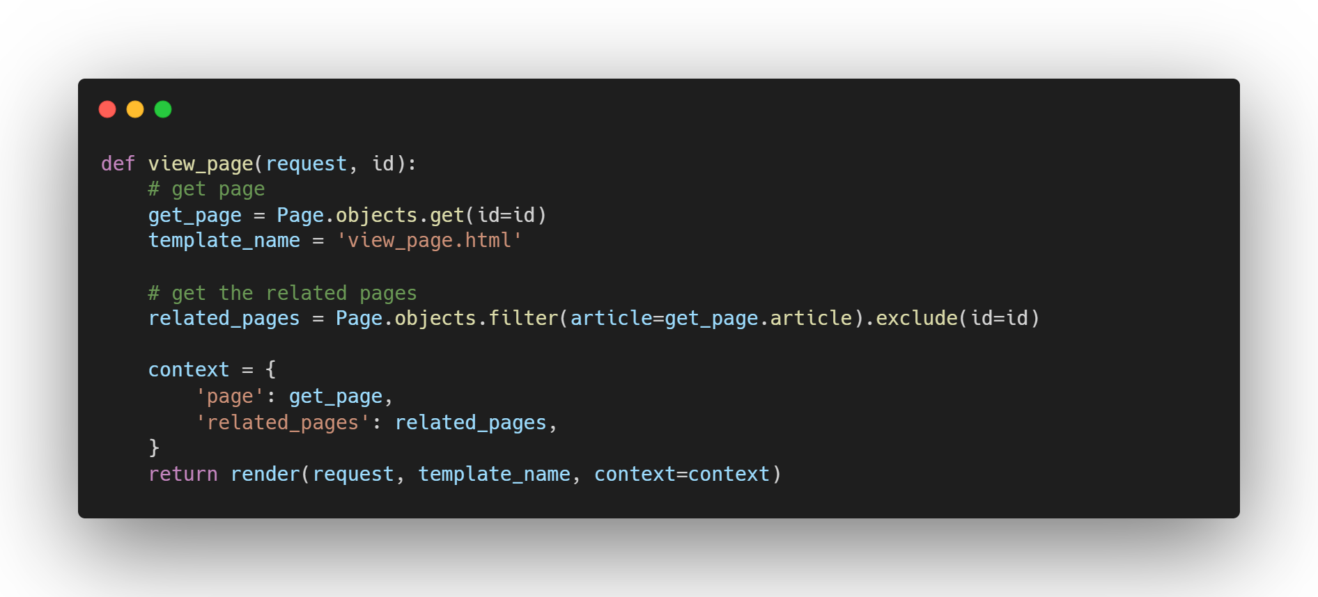 To view the created content inside the page, we would need to have a separate function to handle this. This function takes in an id of a page, checks if itโ€™s in the database and serves it on the template file associated with it. This is also responsible for getting all the related pages(within the same article) on the side for easier access.