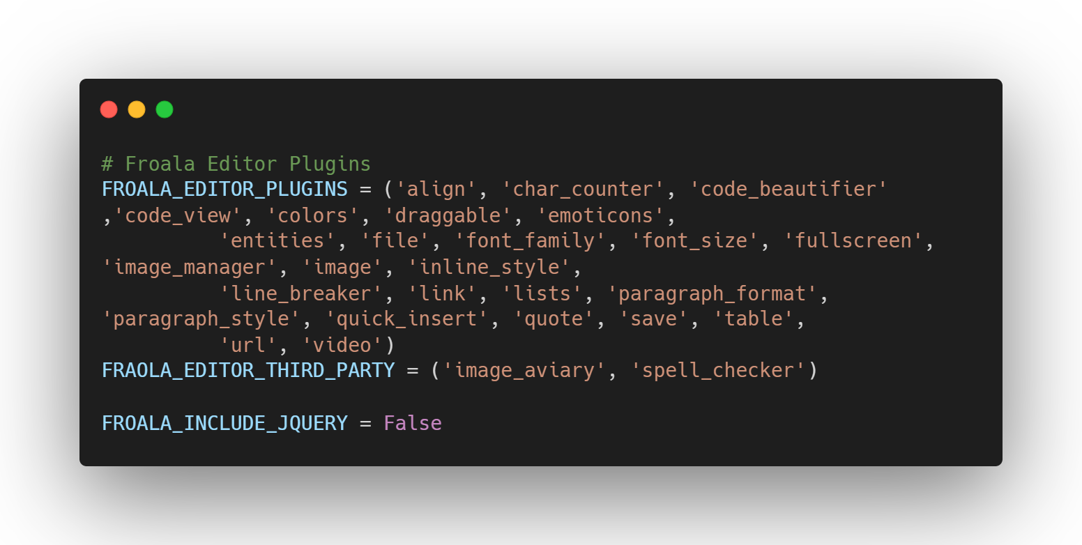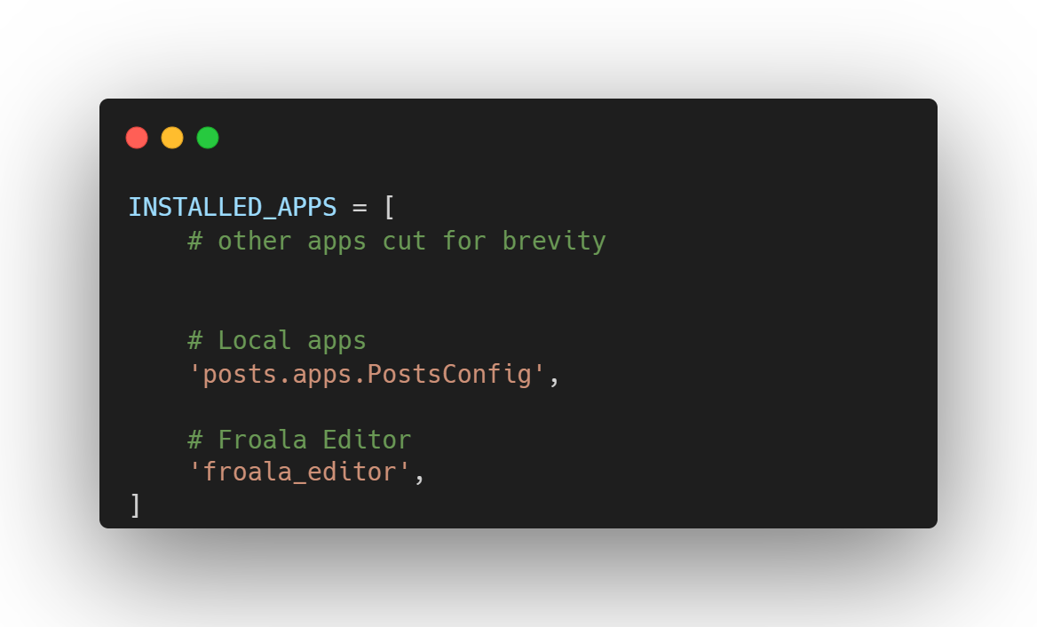 Note: Do not forget to add โ€˜froala_editorโ€™ inside the INSTALLED_APPS else Froala will not work with the application