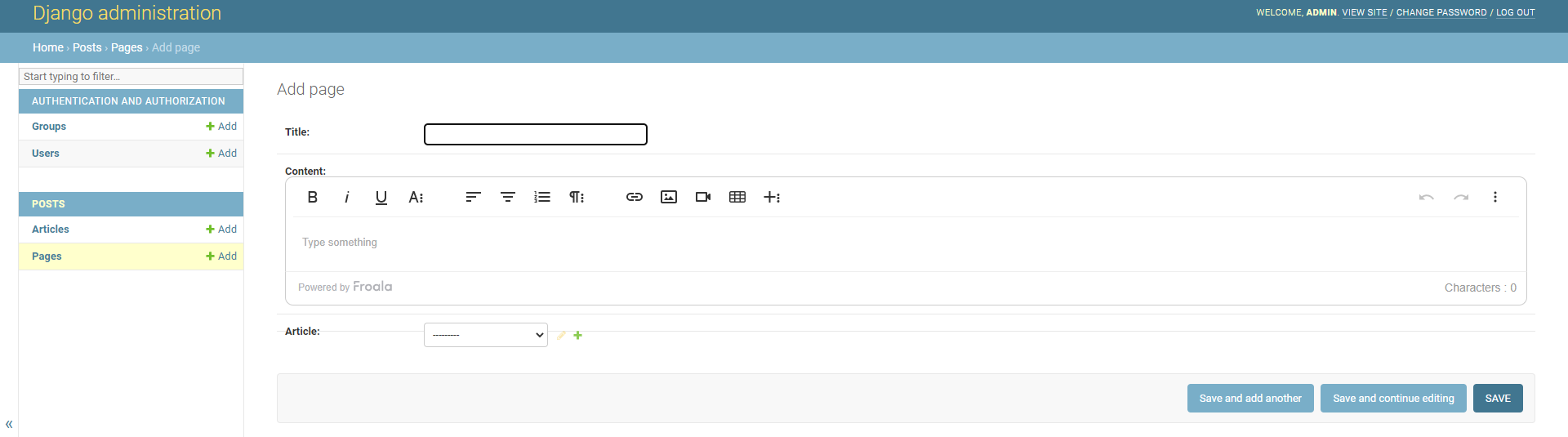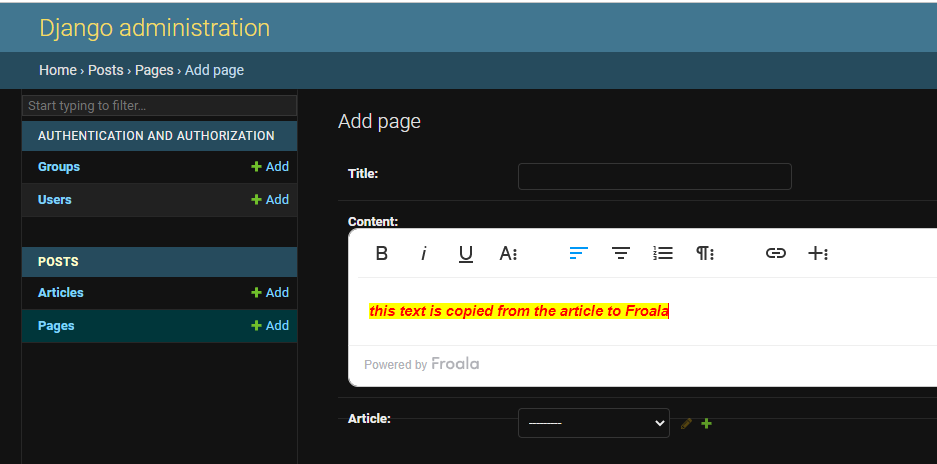 Recall during the creation of the models, specifically the Pages model that we made the content a FroalaField(). This means that if we access it within the built-in Django admin panel, we can see the Froala editor embedded inside when you choose to add that specific model.