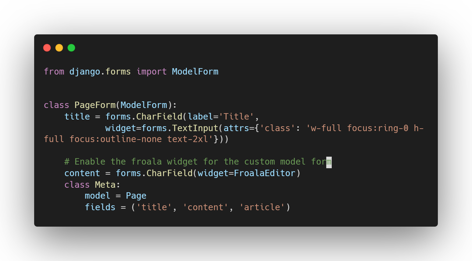 Look closely at the content field and you can see that there is a โ€œforms.CharField(widget=FroalaEditor). This tells Django that we are extending the form to use Froalaโ€™s built in editor when we place it in our html.