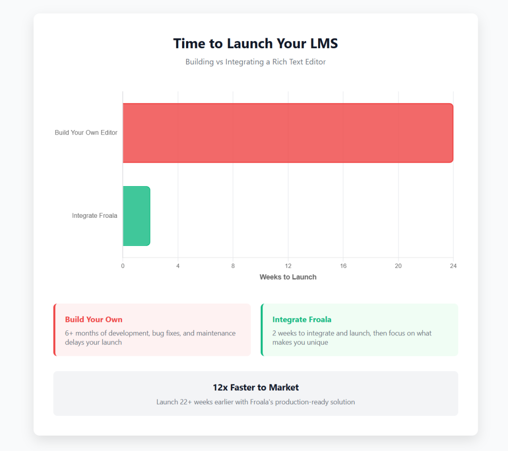 The platforms that win are the ones that launch faster, learn faster, and iterate faster. Froala removes the text editor from your critical path, letting you focus on what actually drives adoption: your gradebook design, your assessment methodology, your analytics insights, your integration ecosystem.