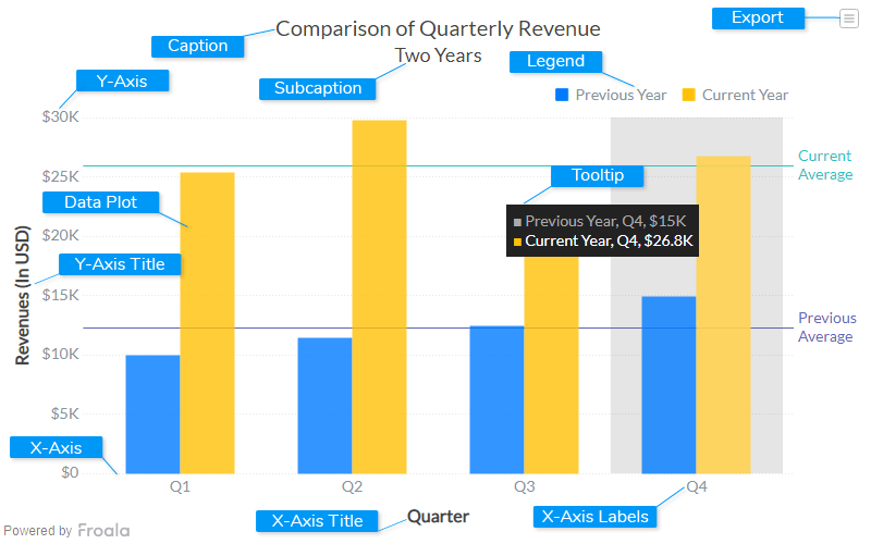 Let's create column chart showcasing the comparison between quarterly revenue earned for the previous year and the current year. The columns for both datasets, one for the previous year and one for the current year, have been rendered using different colors. This makes it easy to interpret and compare the data.