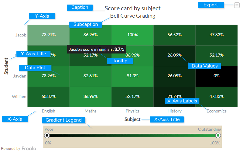 A heat map chart is a specialized chart that uses colors to represent data values in a table. It is mostly used to plot large and complex data. The chart is visualized like a table with a finite number of rows and columns. Cells within the table are rendered in different colors depending upon the range in which the data value they represent belongs to. An icon legend or a gradient legend, depending on the use case, is rendered at the bottom of the chart. This chart can be used to plot data like employee attendance, performance ratings, election results, and so on.