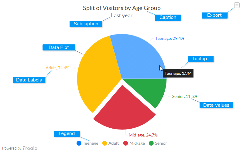 For a detailed list of attributes, refer to the pie charts attribute page.