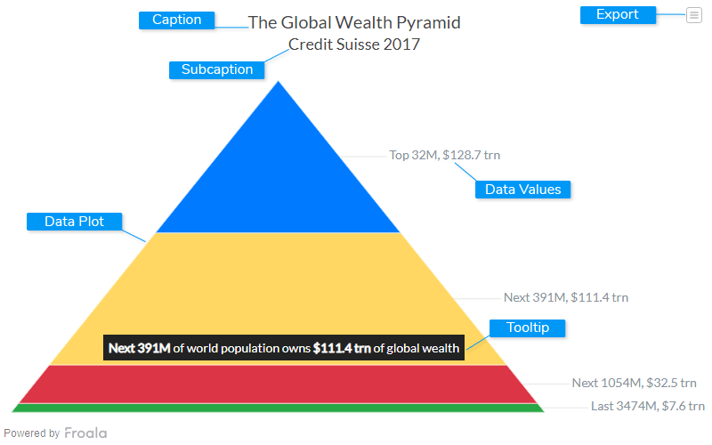 A pyramid chart is used to show the hierarchical structure as well as the quantity of data in a pyramid like structure. The chart is visualized like a pyramid that is made of various segments stacked together. A segment's height is determined by the data value that it represents. The width is determined by the segment's order in the stack of segments and has nothing to do with the data value. Segments can be sliced out in order to focus on a particular phase.