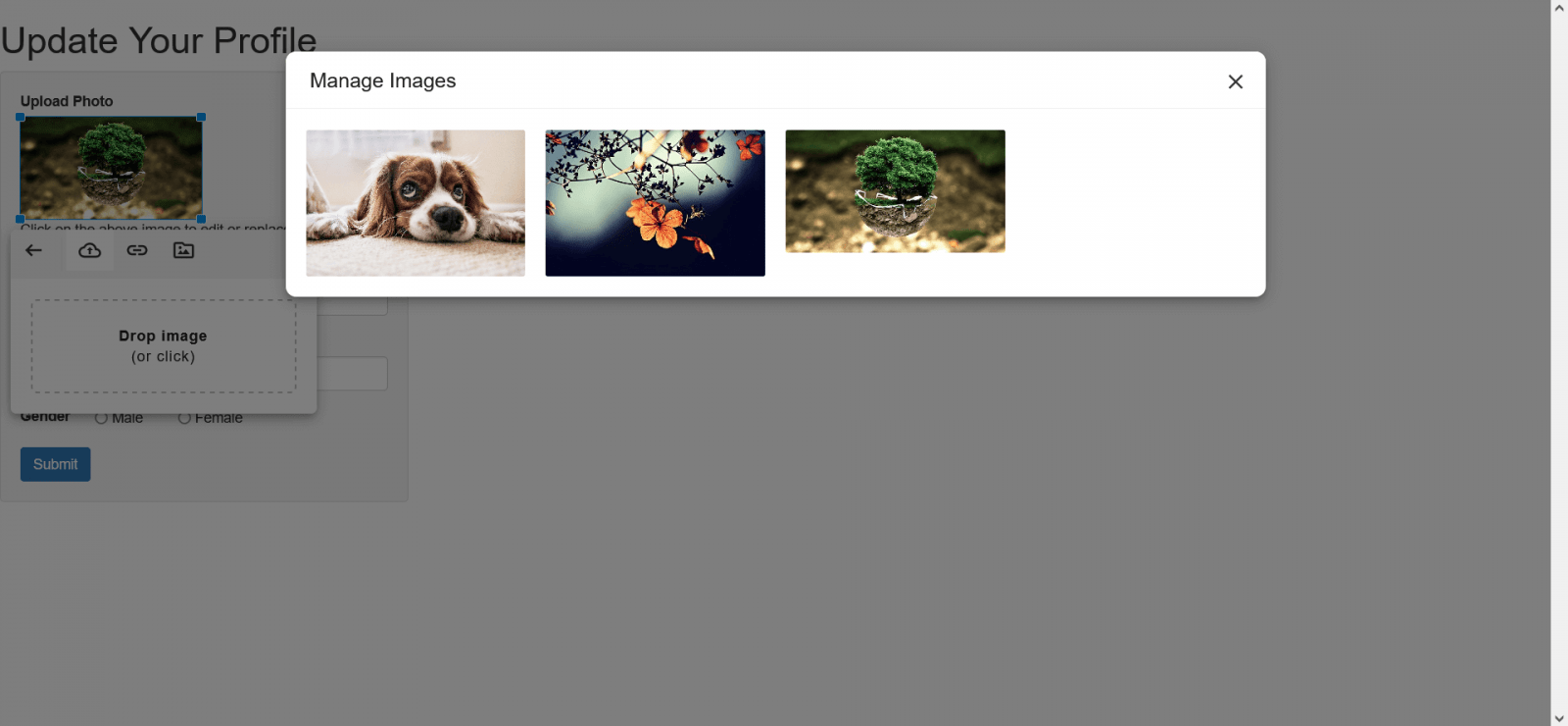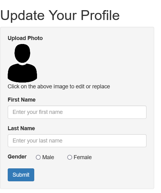 In the code above we have added the image element only. To turn this into a profile form example, let's add a first name, last name, and gender input fields. And let's add the Bootstrap stylesheet to style the form elements.