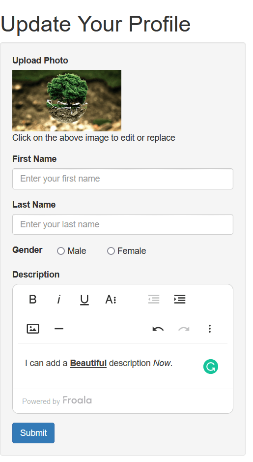 Itโs common to have a text-area field for allowing users to enter a description about their profile. Using Froala WYSIWYG editor you can allow your users to improve their description content by allowing them to style and format their content, Moreover, your users will be able to add videos, images, tables, and links to get a better profile layout and description. All this could be achieved with the same Froala script we have used for image uploading, which means there are no more libraries or resources to take care of. and it is easy to be added to your form.