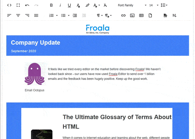 Froala comes with its intuitive UI to eliminate this complexity and make email design a bit of fun.